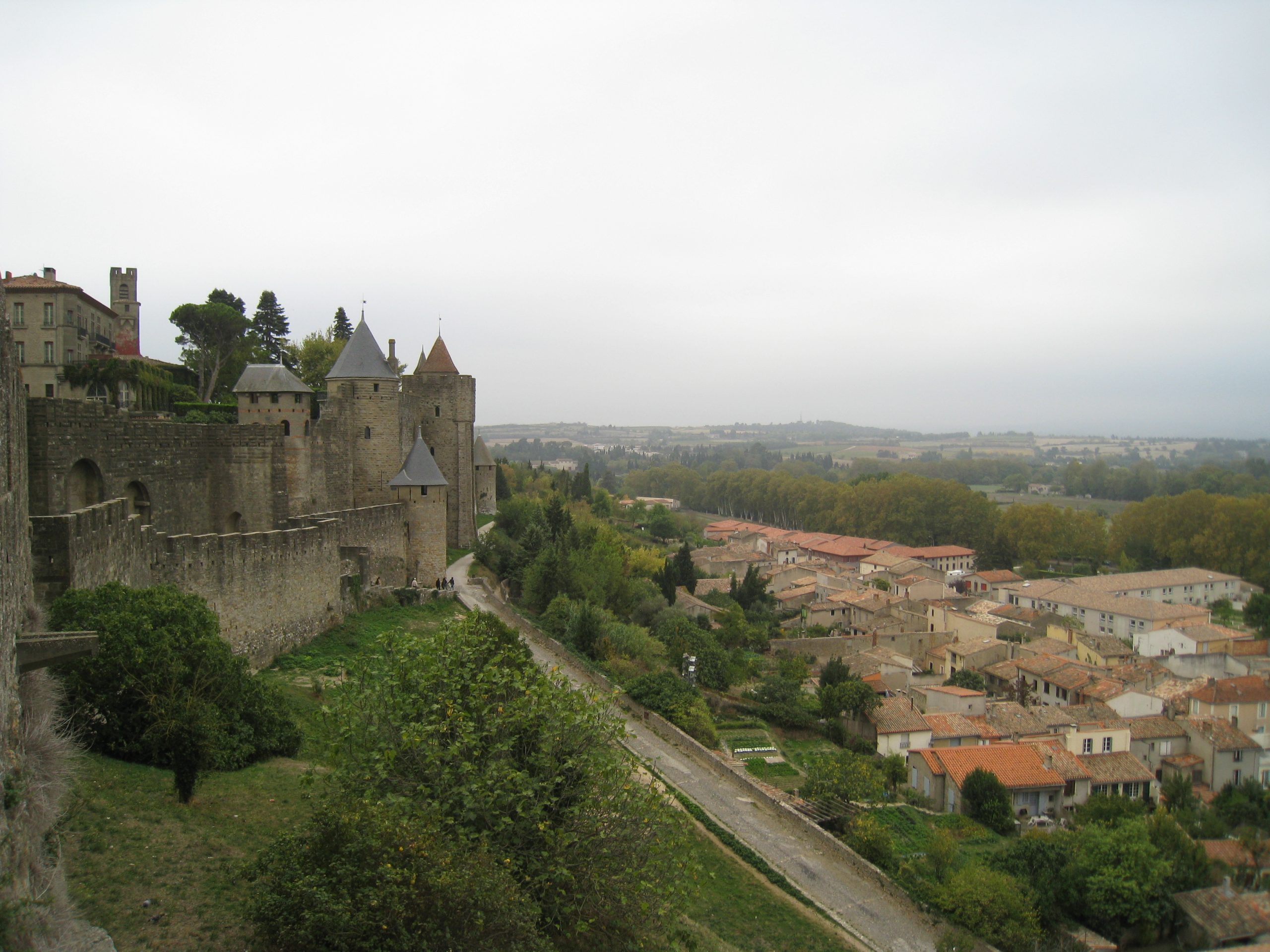 Les muralles dobles que encerclen el conjunt foren construïdes en èpoques ben diferents. La interior és d'època gal·loromana i l'exterior, amb un perímetre de tres quilòmetres i del segle XIII, sota el regnat de Felip III. Aquestes muralles estan acompanyades per cinquanta-dues torres i quatre portes principals, cadascuna en un dels quatre punts cardinals, la de Narbona, la de l'Aude, la de Sant Nasari i la del Burg o Rodés.